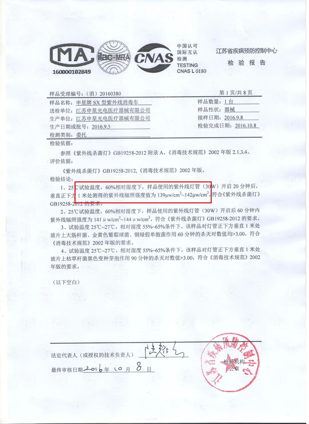 《紫外线杀菌灯》GB 19258-2012中要求,1米处紫外线强度必须达到一定的标准才能达到消毒效果。PA视讯光电紫外线消毒车垂直正下方1米处测得的紫外线辐照强度值为139uw/c~142uw/c㎡。