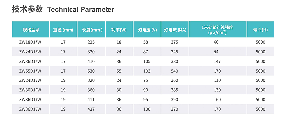 Hot cathode, preheating start. The electrode and quartz glass tube are specially treated to ensure the long service life of the lamp without early blackening. The maintenance rate of ultraviolet light intensity can reach more than 80% of the initial value. High ultraviolet radiation intensity, 1833um / C ㎡ at 10cm.